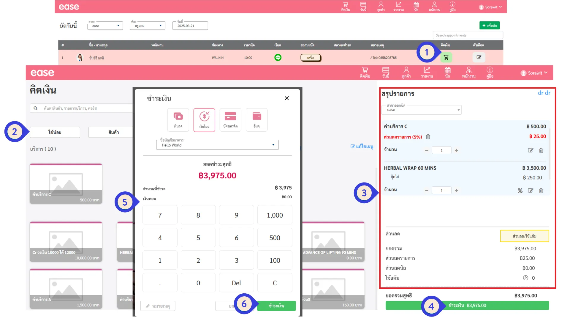 ฟีเจอร์ “ชำระเงิน” ออกแบบมาเพื่อช่วยให้ร้านความงาม เช่น ร้านสปา ร้านทำเล็บ สามารถ คิดเงินค่าบริการ, ขายสินค้า, คอร์สแพ็กเกจ และจัดการค่ามือหรือค่าคอมพนักงาน ได้อย่างเป็นระบบ รองรับการกำหนดค่ามือ ทั้งแบบเปอร์เซ็นต์ (%) หรือแบบจำนวนเงินคงที่