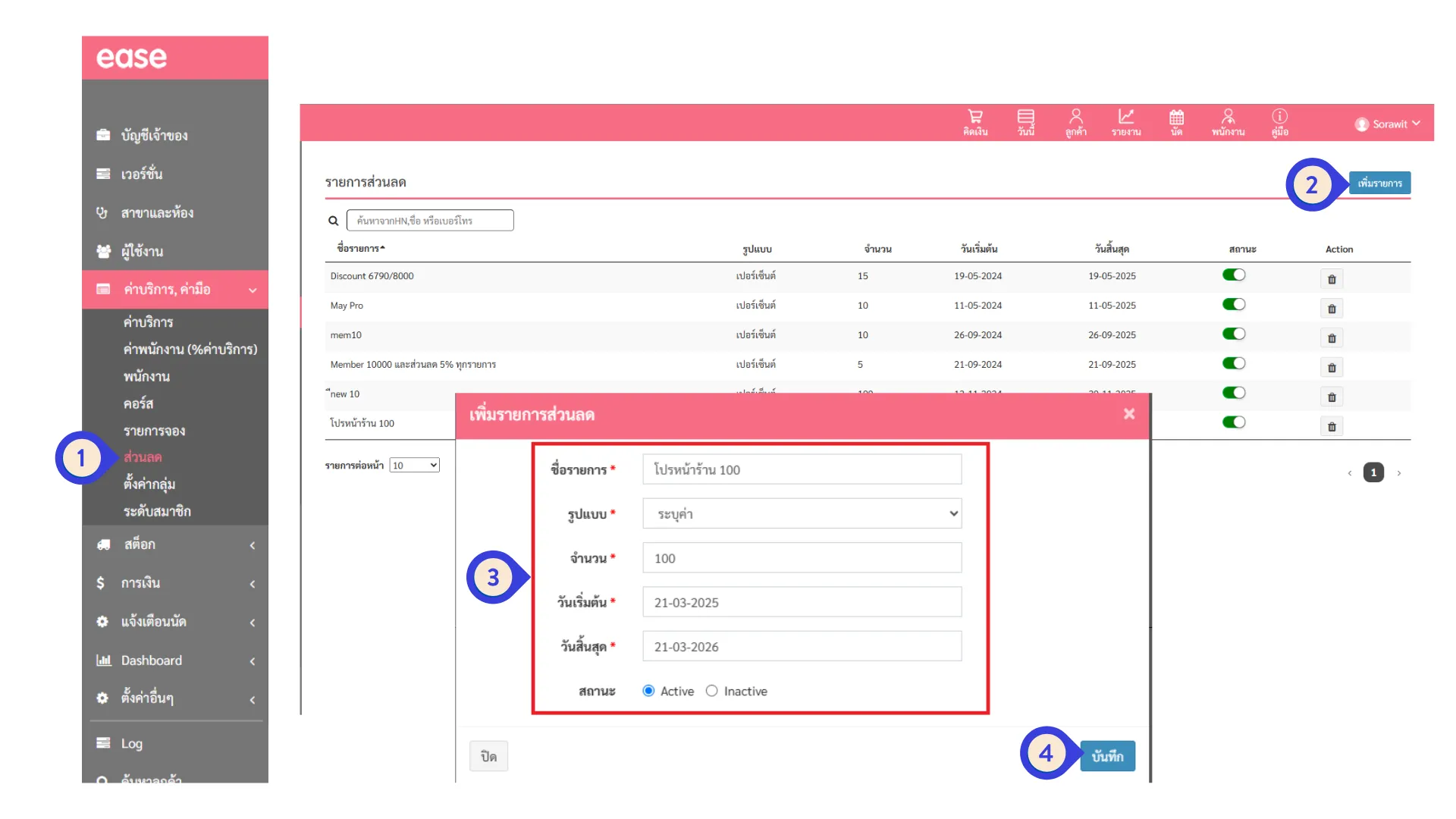 • ไปที่การตั้งค่า > ค่าบริการ, ค่ามือ > ส่วนลด > เพิ่มรายการ